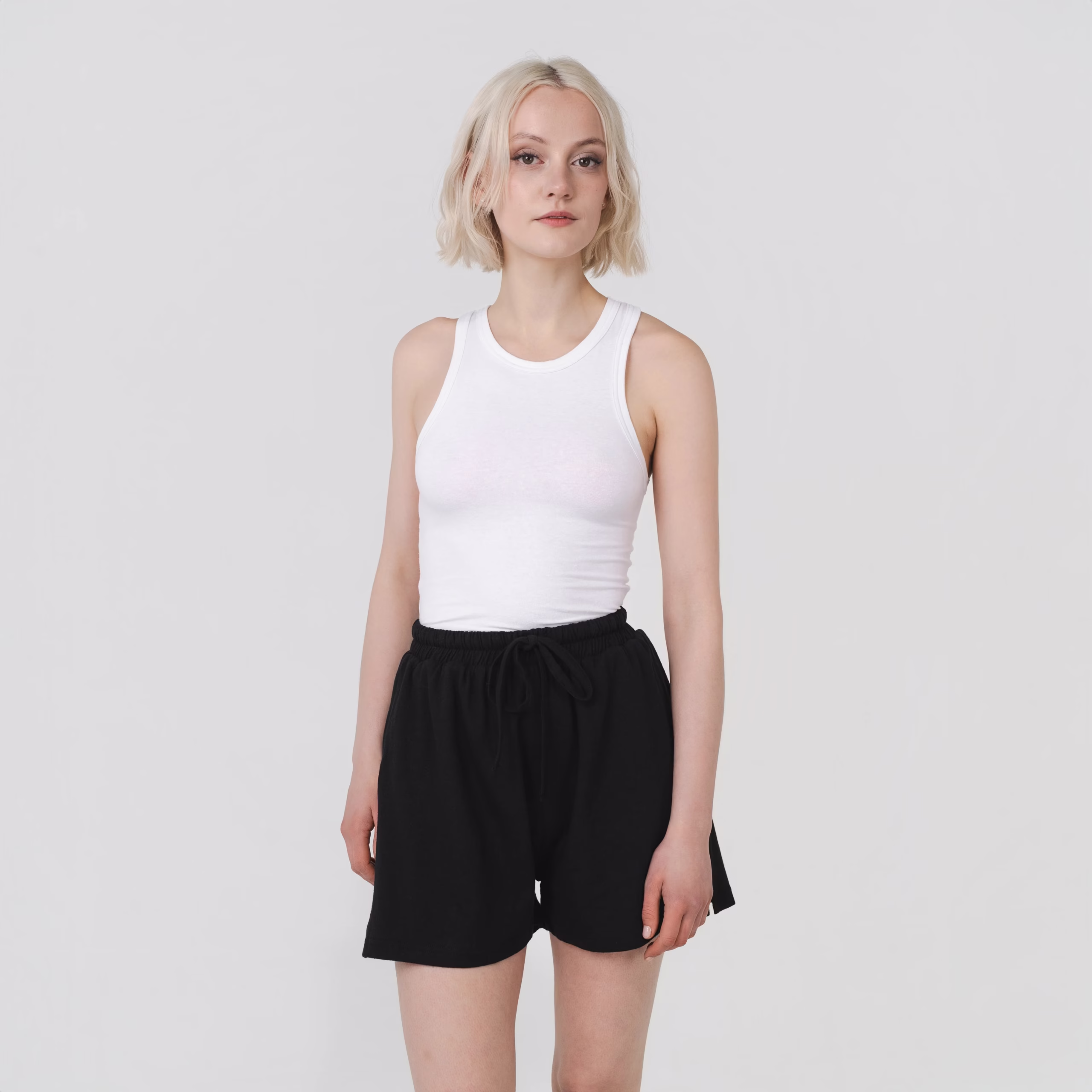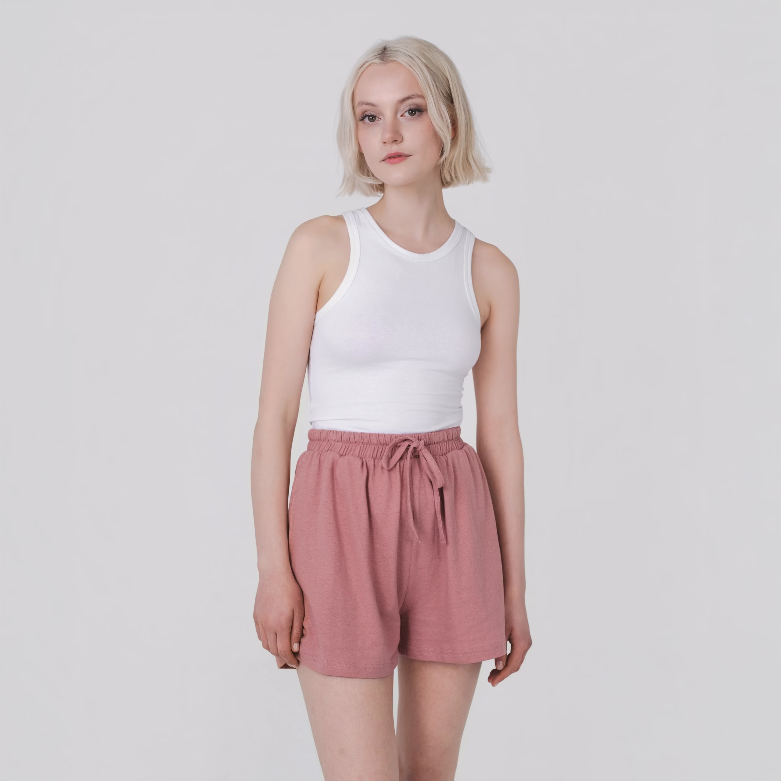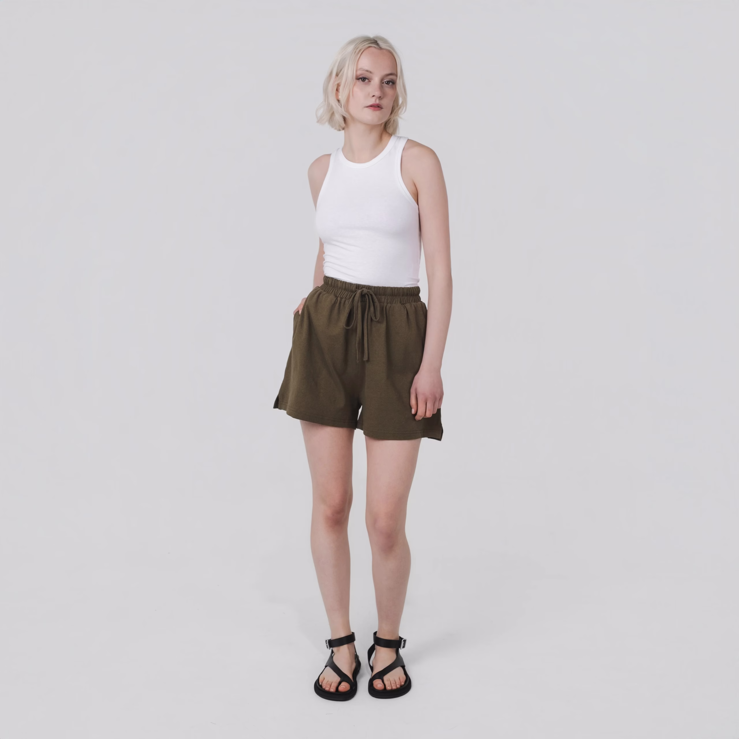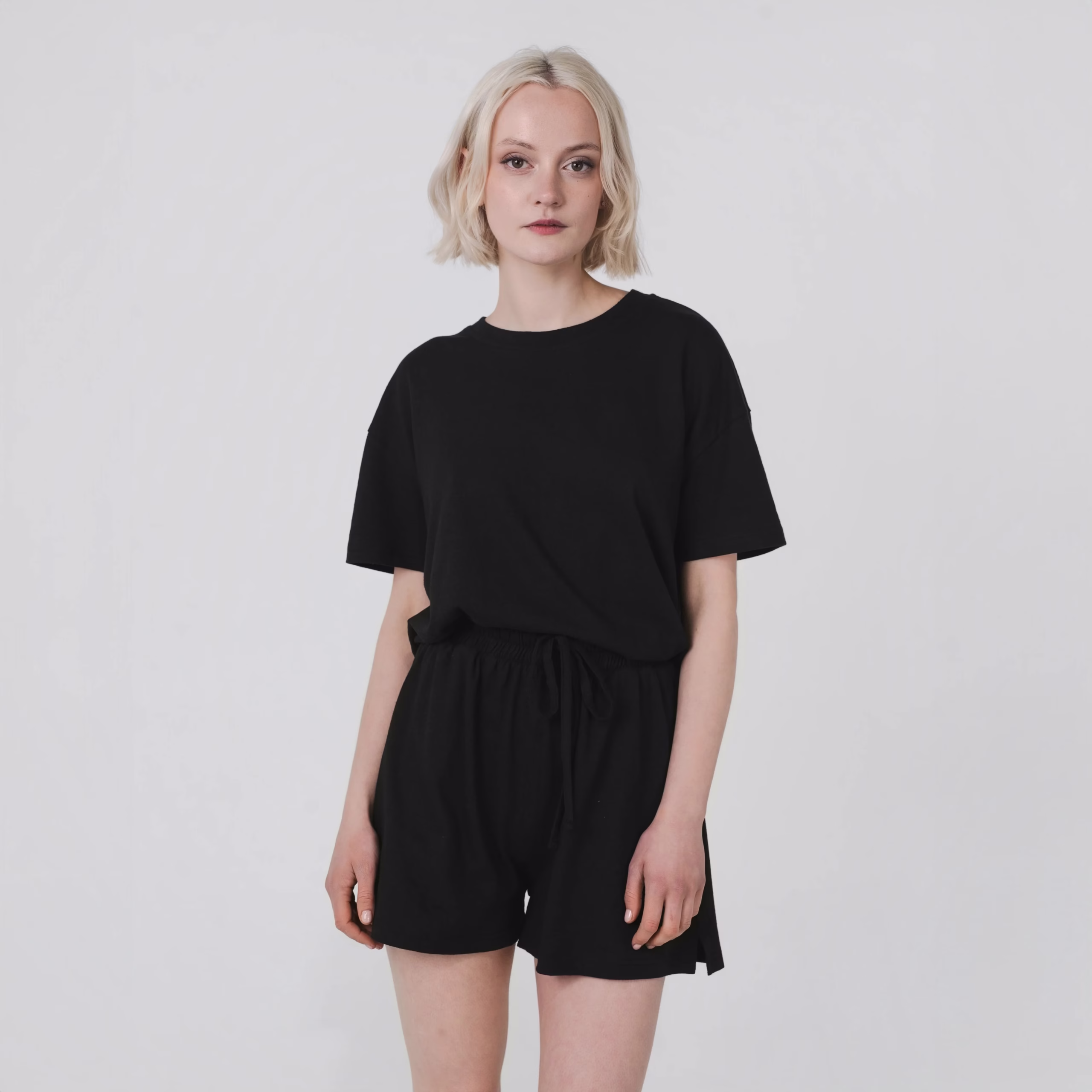 Featuring an elasticated drawstring waistband and functional side pockets, these shorts provide ease of movement and a casual, flattering fit. Perfect for lounging, errands, or outdoor days, they pair effortlessly with the matching Boxy Tee for a coordinated, laid-back look.