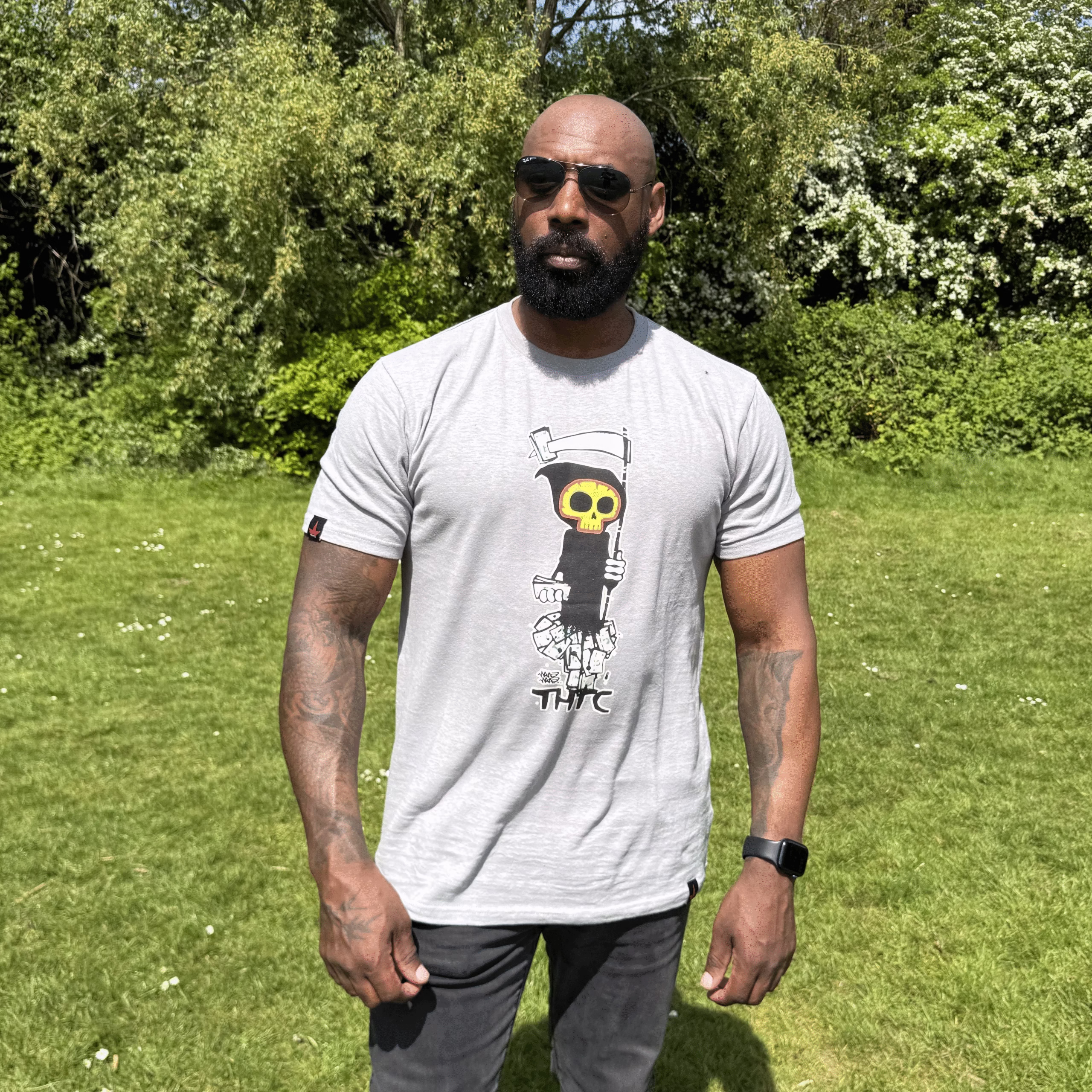 The THTC Bling Reaper Hemp T-Shirt (Premium Weight) fuses dark humour and satire in a striking graphic design, blending activism and streetwear style.