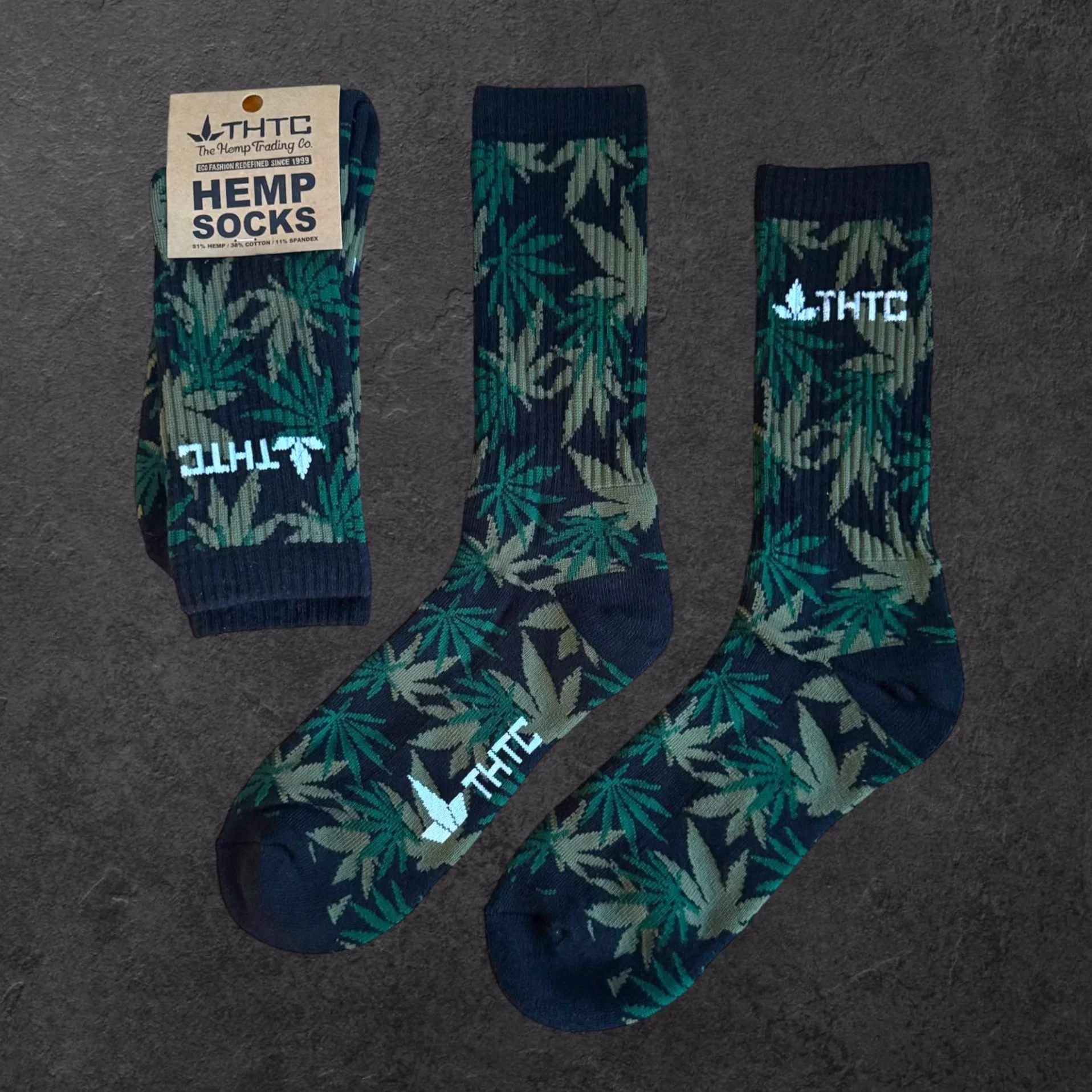 The THTC Camo Weave Leaf Hemp Socks combine camouflage style with hemp durability. Perfect for those who want comfort and sustainability in every step.