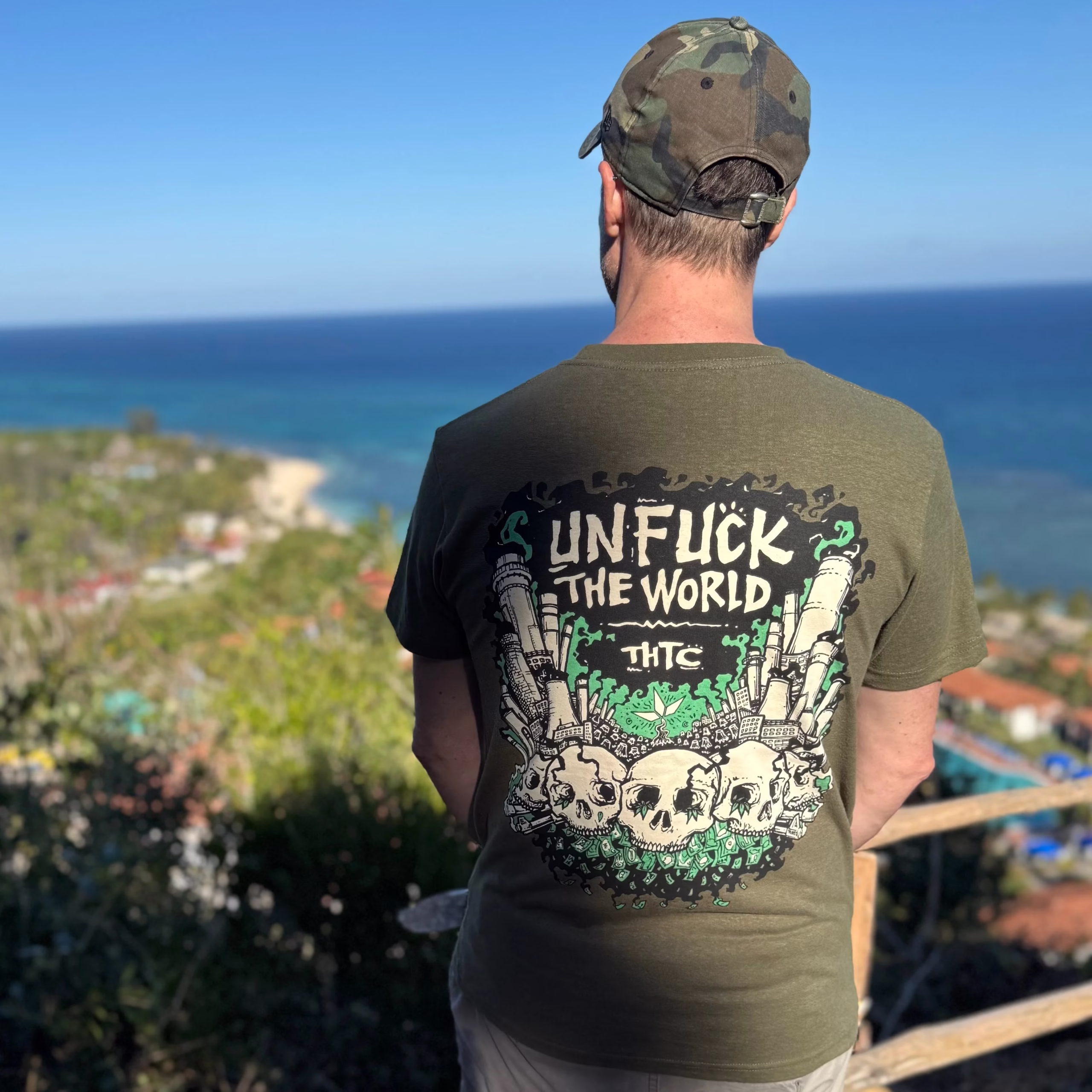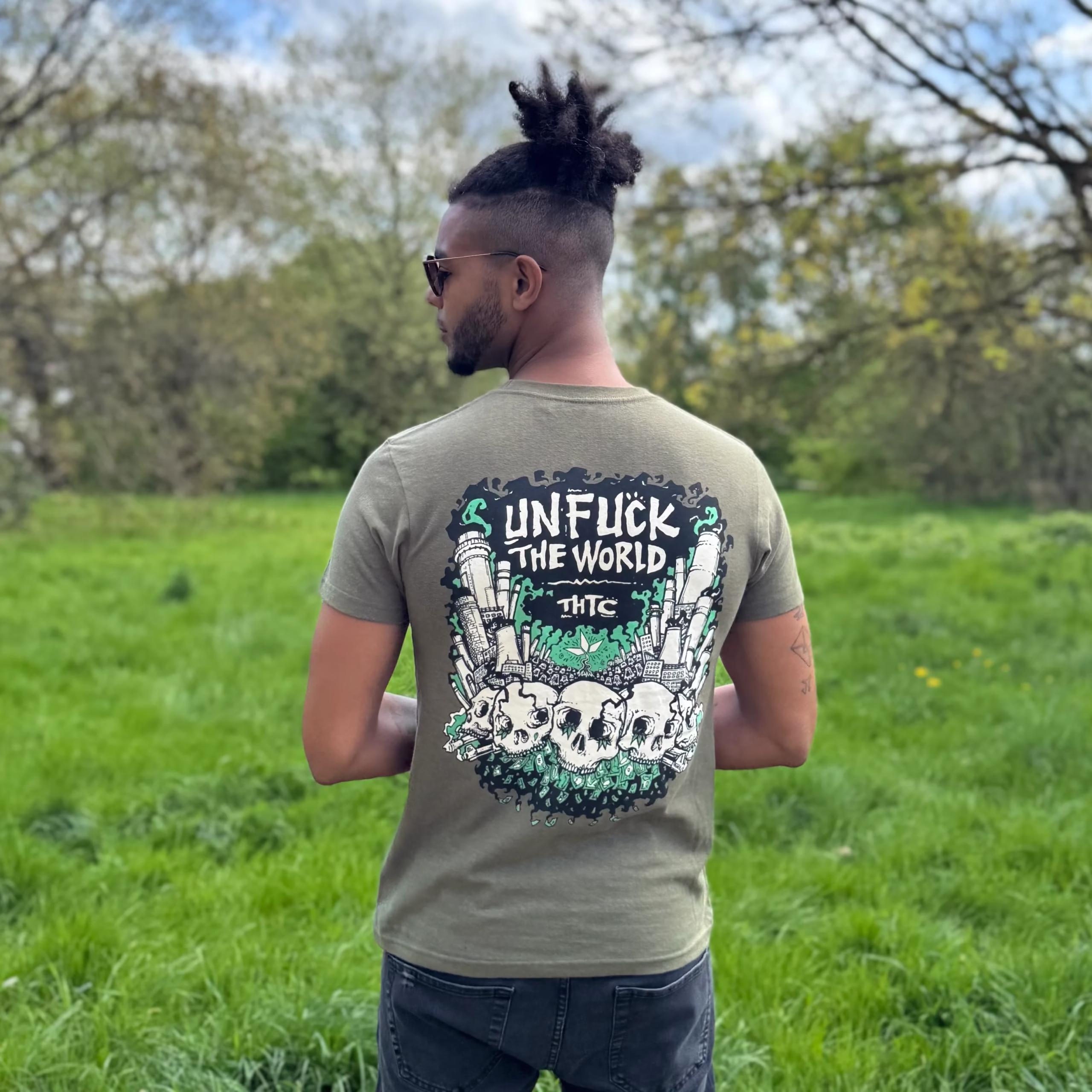 The THTC Tribes Unfuck The World T-Shirt (Premium Weight) is a bold reissue of The Tribes’ 2017 design. Printed on army green, it makes a clear statement that combines activism, art, and sustainability. Many still refer to it as the Unfuck The World Hemp Tee, ensuring both terms resonate in THTC’s collection.